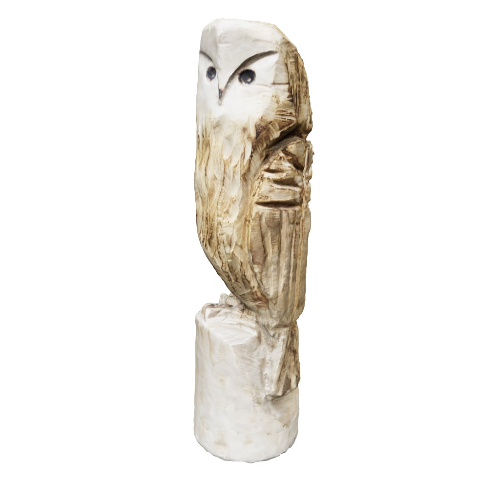 Handgjord motorsågssnidad träuggla i svensk asp – en iögonfallande dekoration för hemmet och perfekt för dig som söker en unik gåva.