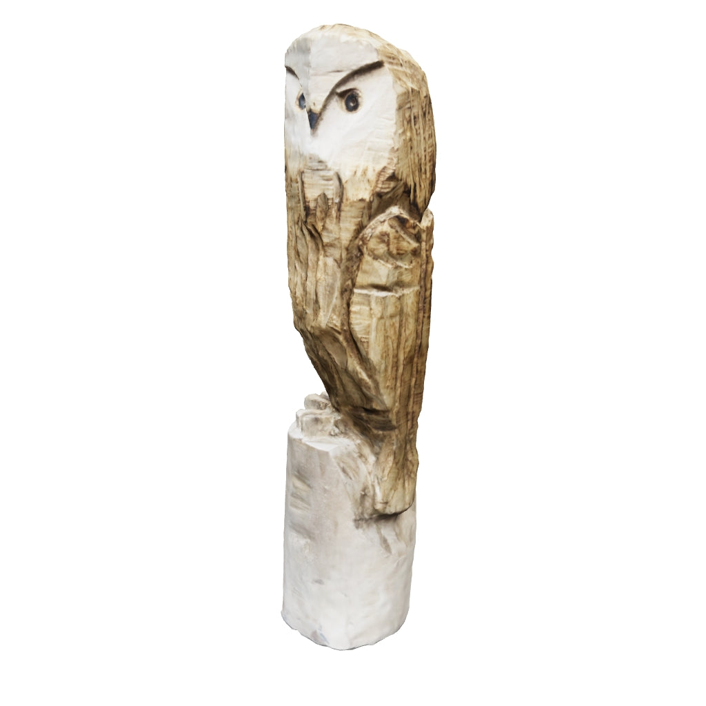 Handgjord motorsågssnidad träuggla i svensk asp – en iögonfallande dekoration för hemmet och perfekt för dig som söker en unik gåva.